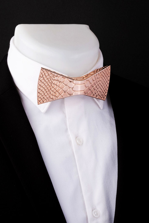 Inspired by one of nature’s most fearsome and visually striking snakes, this bow tie mimics the essence of the red cobra’s power and elegance. The textured snakeskin pattern, bold curves, and reflective 18K rose gold plating echo the cobra’s hypnotic aura and beauty.