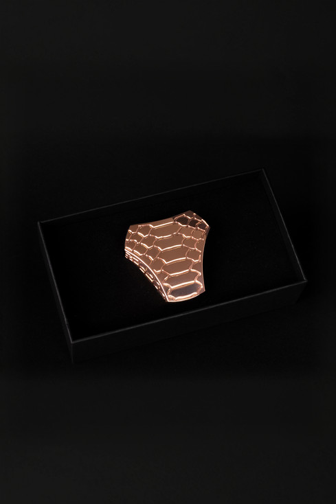 Inspired by the hypnotic elegance and fearsome strength of the red cobra, this sculptural tie knot cover brings power to the most refined detail of your attire. The deep snakeskin texture and 18K rose gold plating evoke both danger and allure — creating a statement that is both primal and polished.