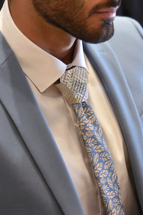 Each piece is shaped by hand from a flat metal sheet into a dimensional form that frames and elevates the necktie knot – redefining tradition with detail, texture, and confidence.